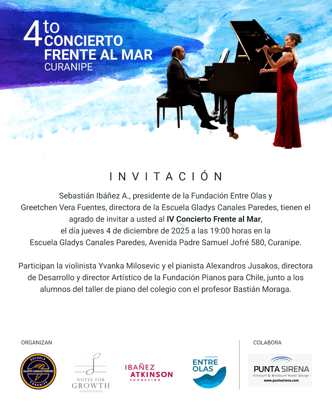 Ven a participar de nuestro IV Concierto Frente al Mar, este jueves 4 de diciembre a las 19.00 horas en la Escuela Gladys Canales Paredes de Curanipe junto al pianista Alexandros Jusakos, la violinista Ivanka Milosevic y los niños del taller de piano del colegio, a cargo del profesor Bastián Moraga.